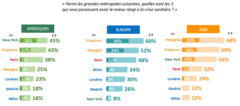 Si l’on fait abstraction des sensibilités géographiques qui amènent les investisseurs à surestimer les métropoles de leur continent, on observe une réelle convergence sur l’appréciation des mesures prises par les global cities pour sortir de la crise. Paris est partout la mieux placée des régions européennes.
