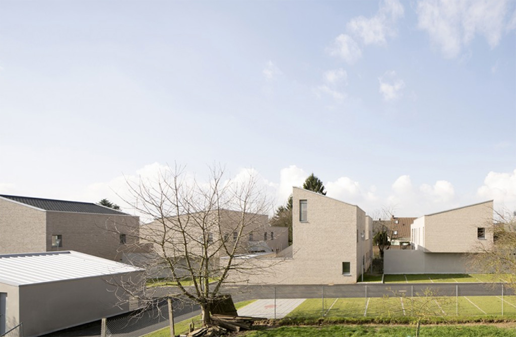 À Bernes-sur-Oise (95), 20 logements intermédiaires ont été construits sur une « dent creuse » dans un lotissement pavillonnaire. Il s’agit d’une parcelle longue et étroite sur laquelle est venue s’implanter un projet de 20 logements intermédiaires constitués en 5 plots R+1+C, comprenant chacun 4 logements, et desservis par trois venelles privatives. Chacune d’elle dispose d’un local commun. La brique claire, posée à joint creux, a été choisie comme matériau principal de revêtement afin de donner au projet un aspect à la fois contemporain et sobre. Le projet atteint les objectifs RT2005-20%.